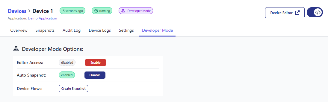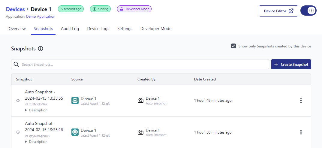 • Two weeks ago, we introduced auto snapshots for devices to help ensure you can always rollback to a previous version of your Node-RED flows. We're extended that ability to the hosted Node-RED instances as well.